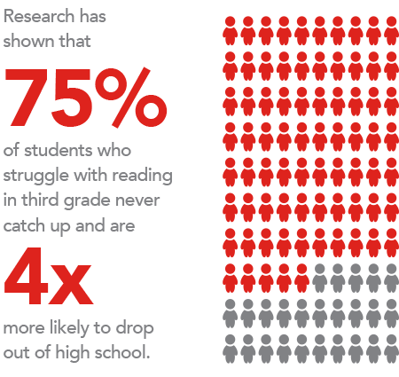 Kids have four short years to become proficient readers. Teachers do the best they can to teach reading by Grade 3, but classes are big and resources limited. Then in Grade 4, the curriculum switches from learning to read to reading to learn. If you’re not reading by the switch, the challenges snowball. By fifth grade you’re a year behind. By ninth, you’re two years behind and unlikely to graduate from high school.