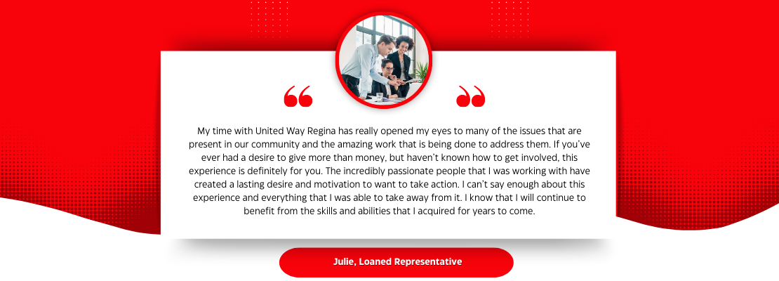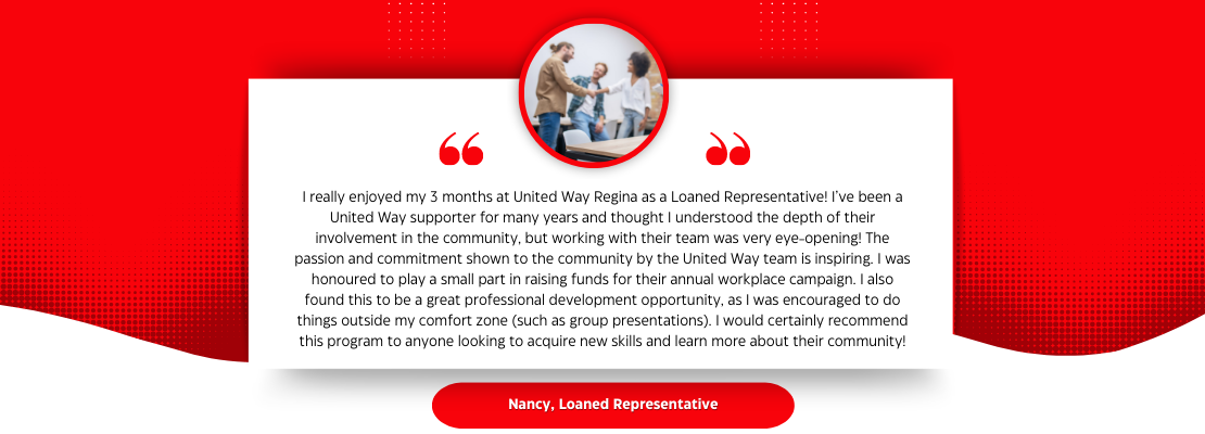 If any of these points speak to you, taking part in United Way Regina’s Loaned Representative Program (LRP) may be just what you need. We are looking for enthusiastic employees to take on this unique role to help us raise funds and make a difference in our community.